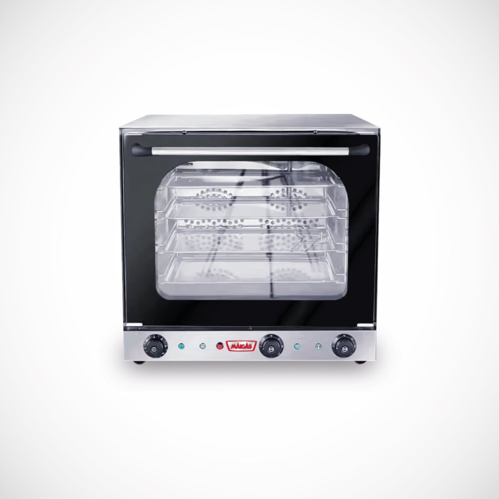 Equipado con dos turbinas de gran resistencia que garantizan una circulación de aire caliente continuo, este horno entrega una distribución uniforme del calor en toda su cámara de cocción. Cuenta con un sistema de humidificación manual por pulso y control de temperatura ajustable, asegurando una cocción precisa. Además, podrá gratinar sus preparaciones gracias a su sistema de cocción superior Grill.Su estructura en acero inoxidable, doble turbina y puertas de vidrio dual templado, ofrecen durabilidad y seguridad. Cuenta con 4 bandejas, iluminación interior y controles de tiempo y temperatura. Ideal para panaderías, pastelerías y cafeterías profesionales.Características Generales
