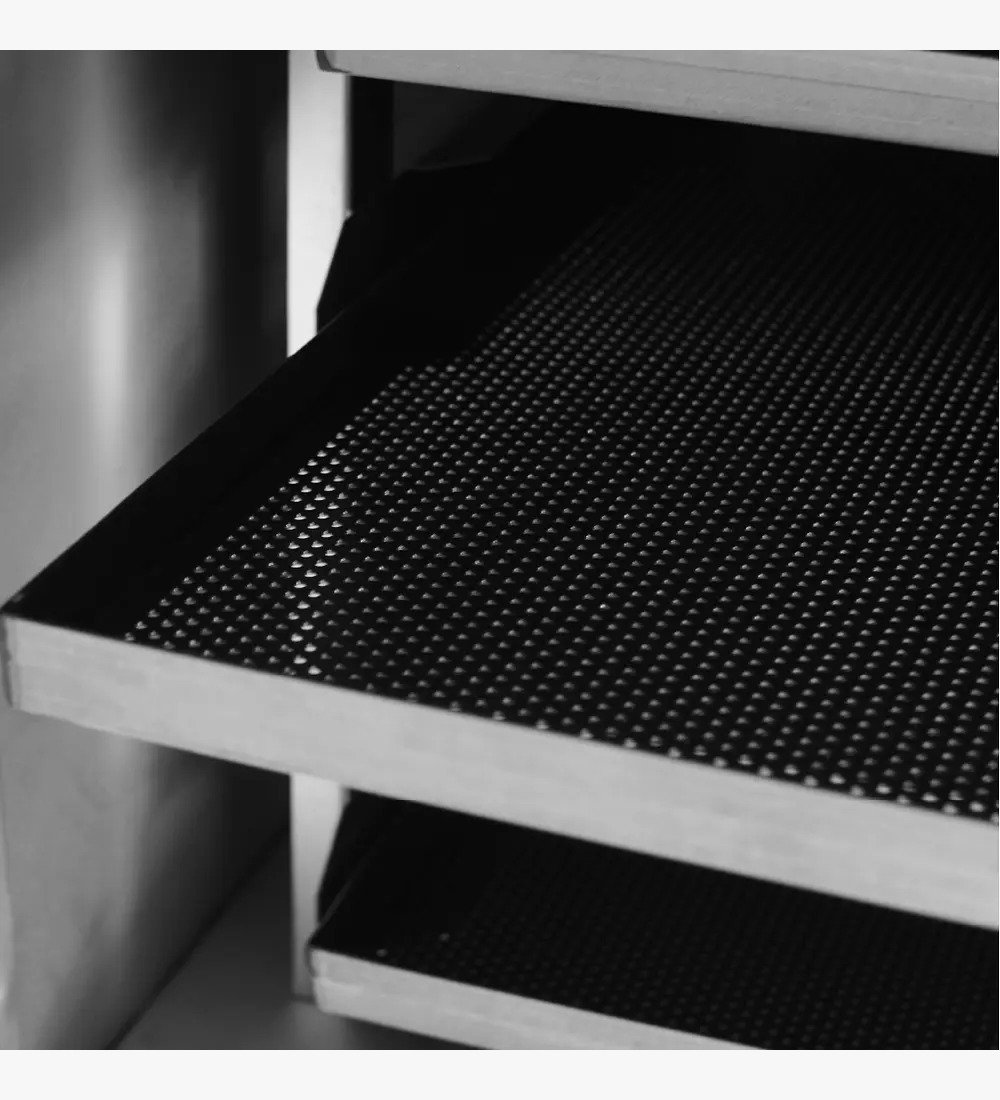 - Soporte para bandejas de 580 x 680 mm en acero inoxidable reforzado.